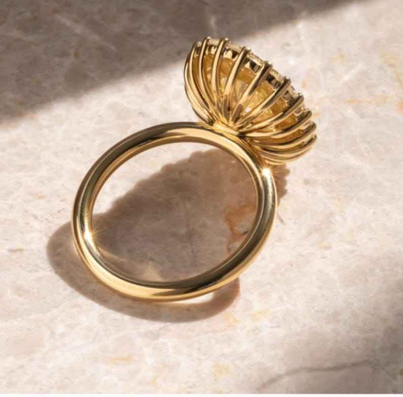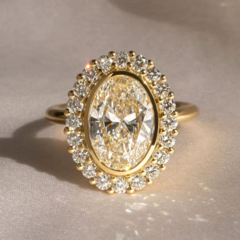 แหวนเพชรทรงรีแบบ Halo คลาสสิก ได้รับการรับรองจาก IGI สำหรับผู้หญิง ทองคำ 14K สีเหลือง สำหรับเจ้าสาว งานหมั้น งานแต่งงาน และเป็นของขวัญแทนใจ