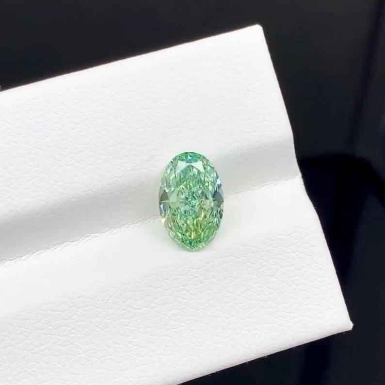 เพชร CVD สีเขียวสดใส ขนาด 1.01 กะรัต รูปทรงวงรี ผลิตในห้องปฏิบัติการ ได้รับการรับรองจาก IGI สำหรับทำเครื่องประดับและแหวน
