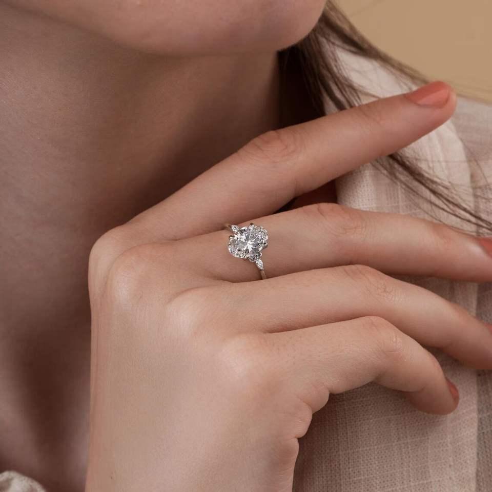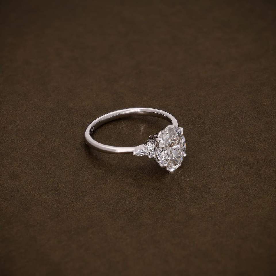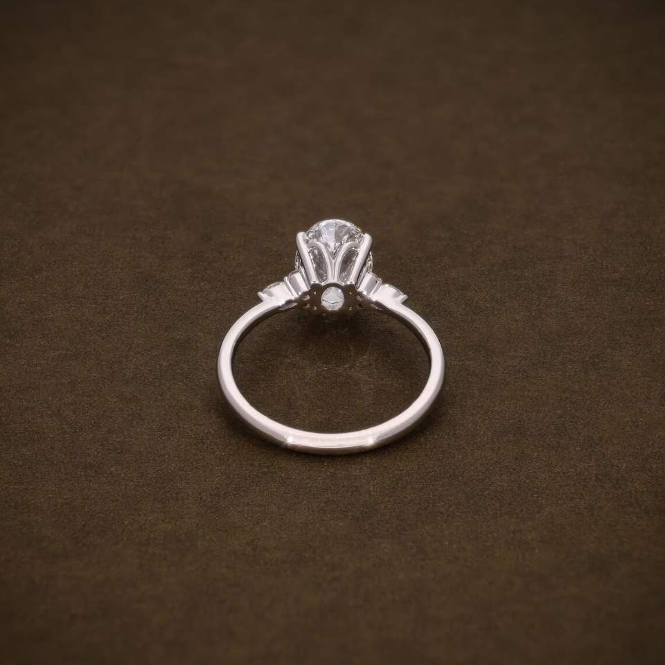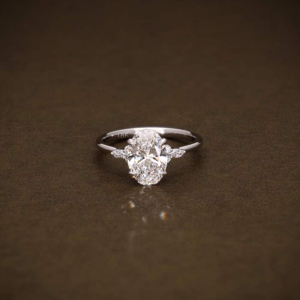 แหวนหมั้นเพชรทรงรีที่ได้รับการรับรองจาก IGI ประดับเพชรทรงมาร์คีส์และทรงกลม ตัวเรือนทองคำแท้ เครื่องประดับสำหรับงานแต่งงาน