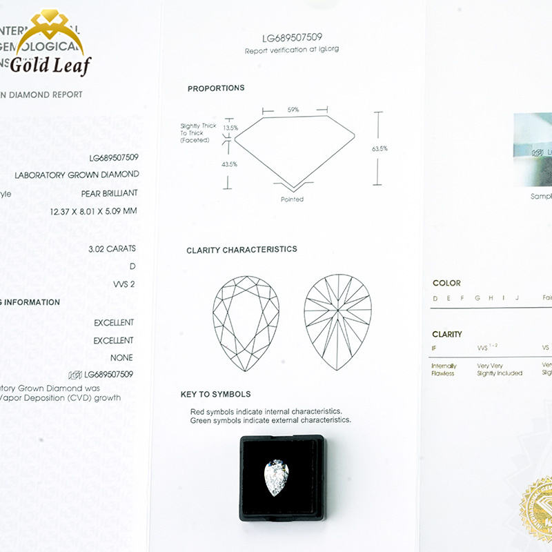 เพชรทรงลูกแพร์เพาะเลี้ยงในห้องปฏิบัติการ ได้รับการรับรองจาก IGI สี DEF น้ำหนัก 1-7 กะรัต ความสะอาด VVS VS1 ผลิตด้วยวิธี HPHT CVD