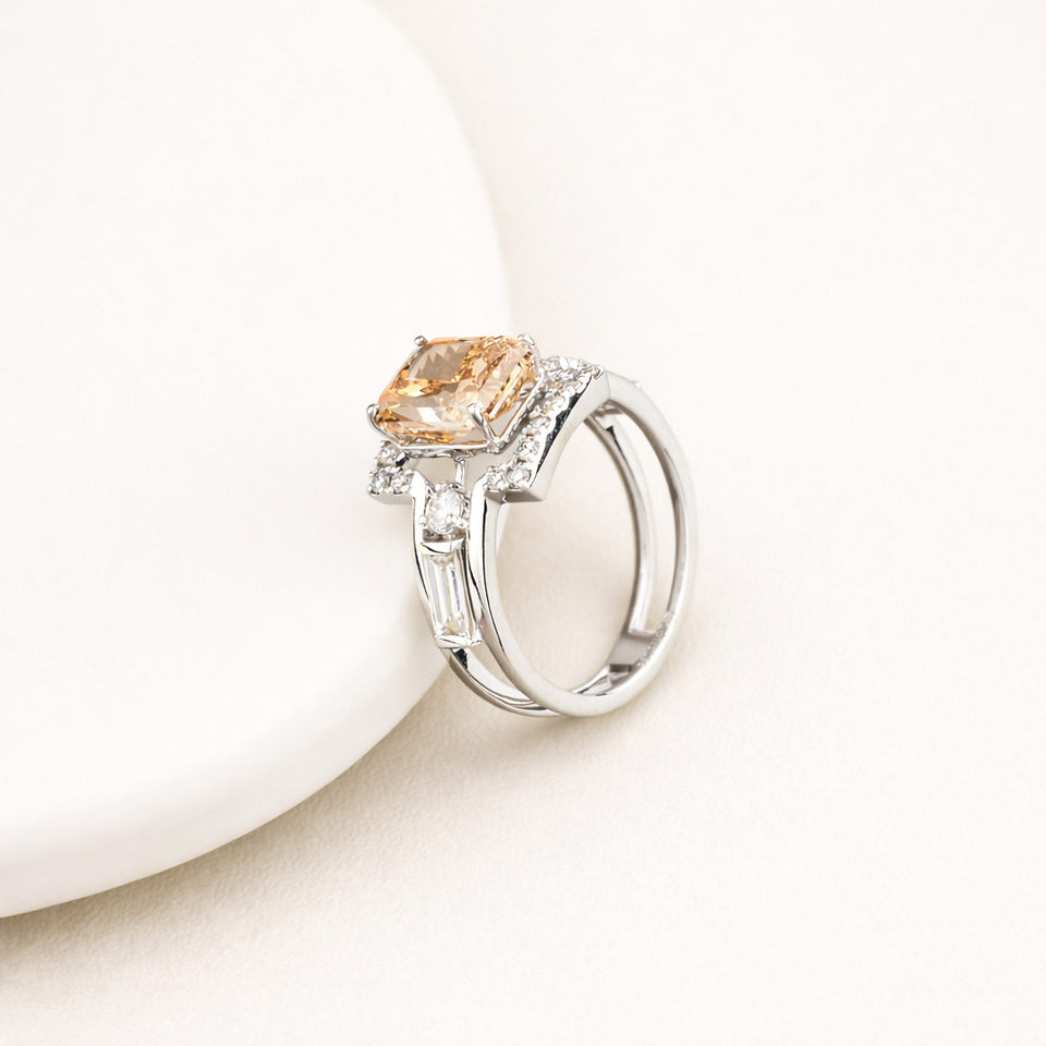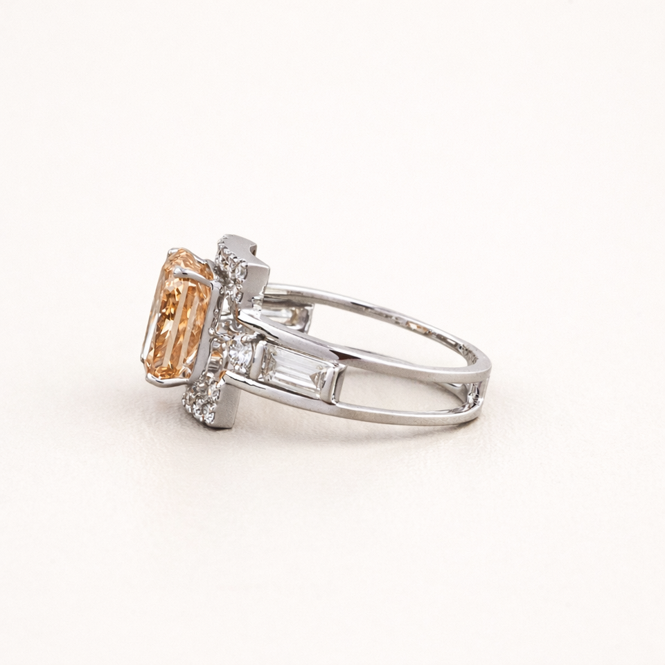 แหวนเพชรทรงเรเดียนท์สีส้มที่ได้รับการรับรองจาก IGI พร้อมเพชรทรงบาแกตต์ด้านข้าง ประดับบนตัวเรือนทองคำขาว/โรสโกลด์/เยลโลว์โกลด์ 9K พร้อมถุงใส่