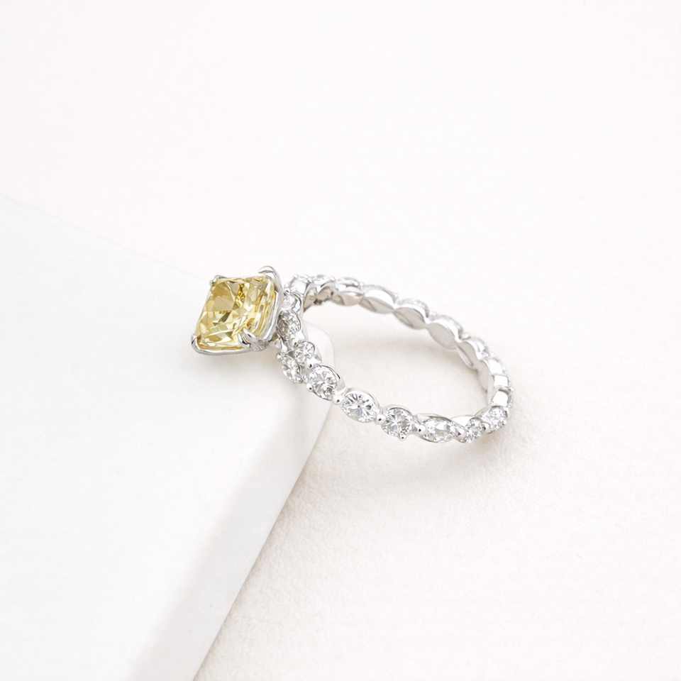 ชุดแหวนเพชรปลูกในห้องทดลองสีเหลืองสดใสได้รับการรับรองจาก IGI พร้อมด้วยเพชรรูปทรงมาร์คีนในแถบสีขาว/กุหลาบและสีเหลืองทอง14K