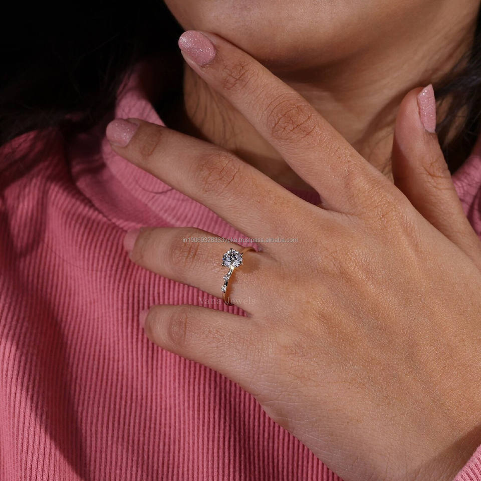 Igi แหวนหมั้นเพชรสำหรับปลูกในห้องปฏิบัติการทรงกลมที่มีสามสไตล์หินสีทอง18K สำหรับงานแต่งงานหรือของขวัญครบรอบปี
