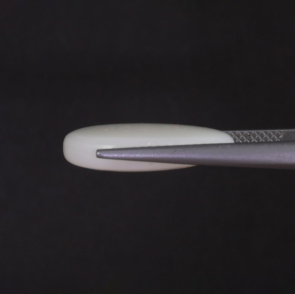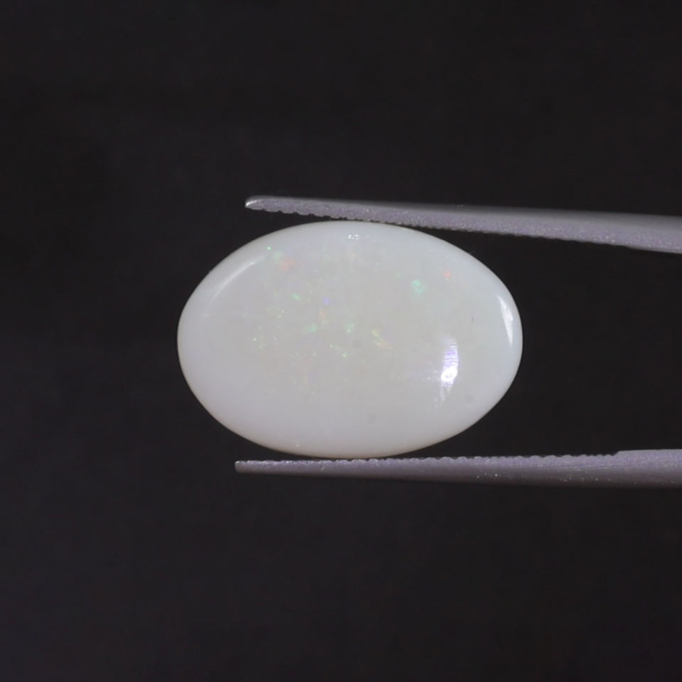 โอปอลธรรมชาติสีขาวรับรองโดย IGI น้ำหนัก 6.71 กะรัต รูปทรงวงรี 18.5x12.5 มม. ตัดด้วยมือ ขัดเงา ผ่านการเคลือบแว็กซ์/น้ำมัน คุณภาพดี