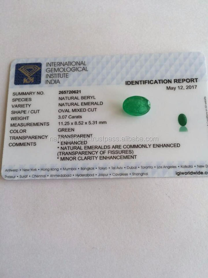 อัญมนีทรงรีตัดด้วยมรกตสีเขียวตามธรรมชาติได้รับการรับรองจาก IGI