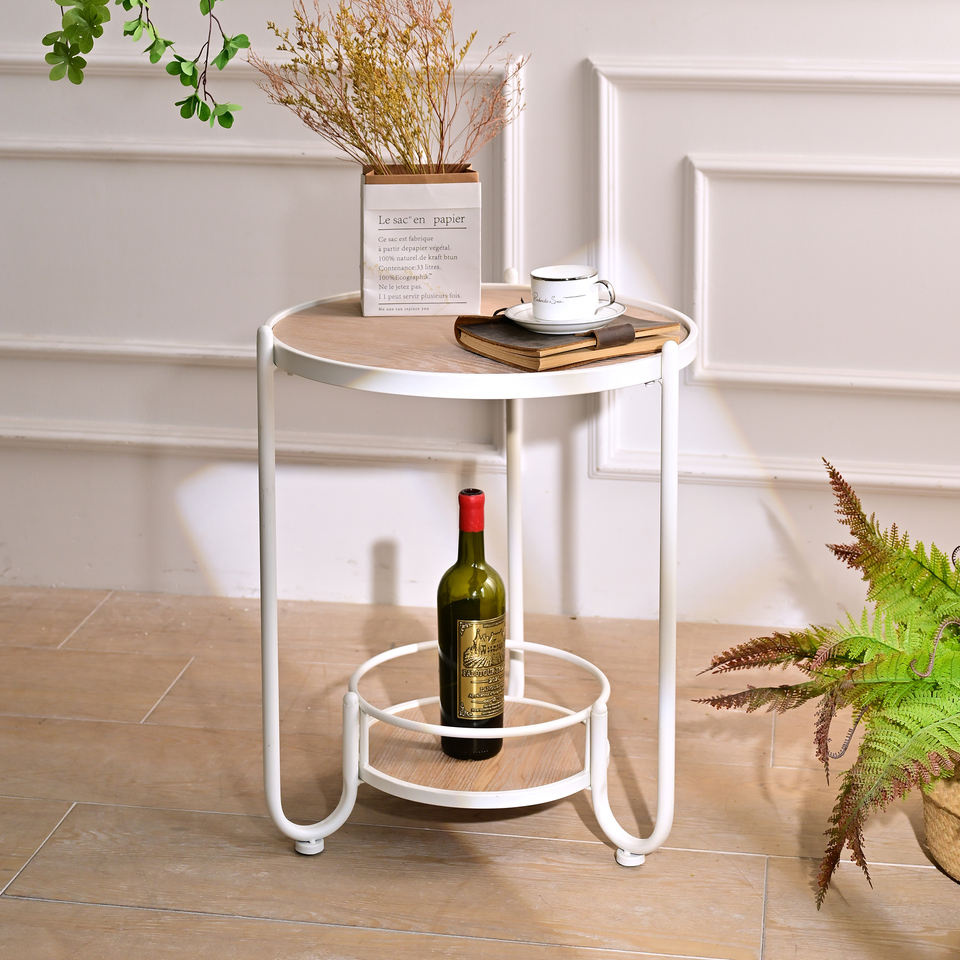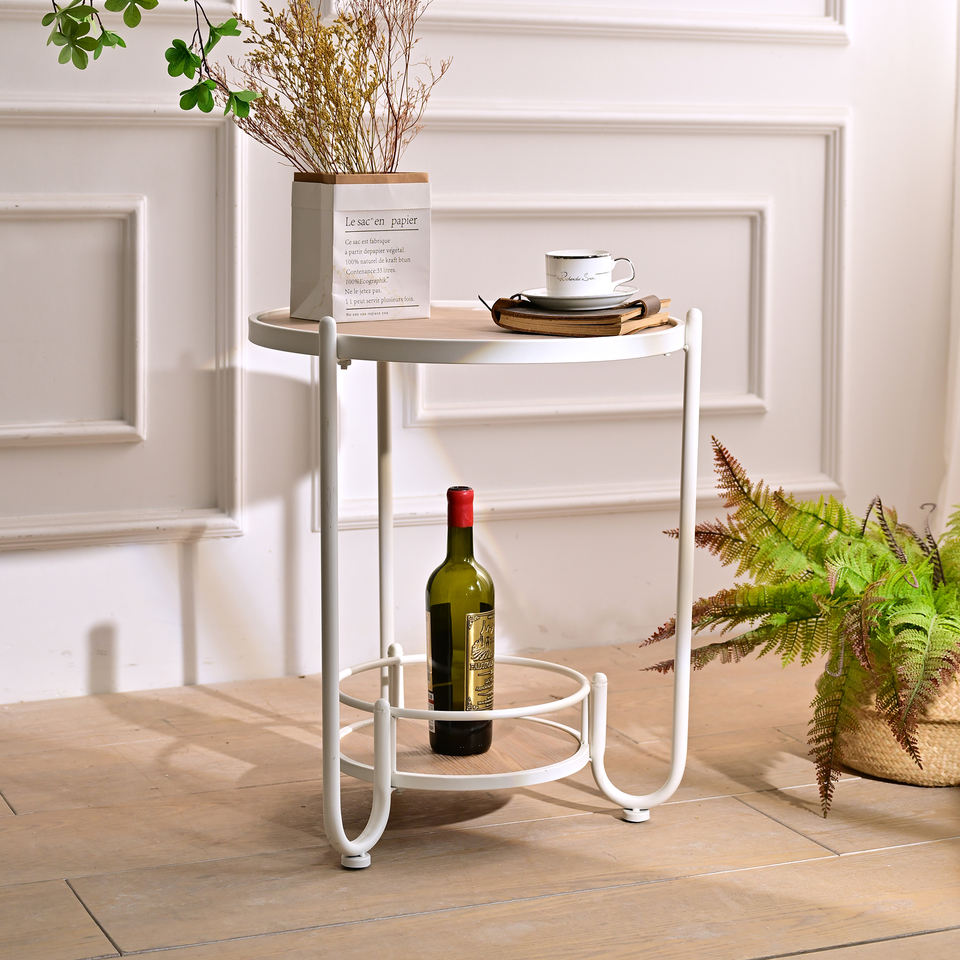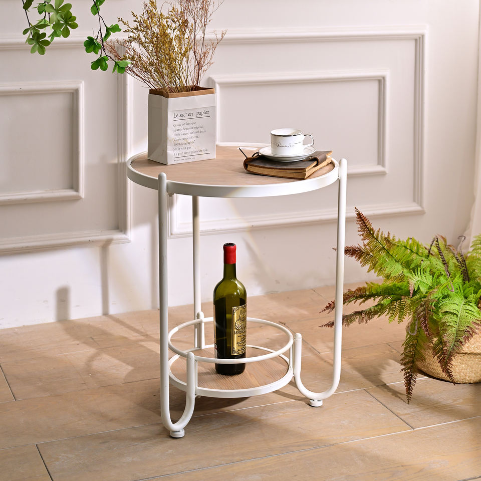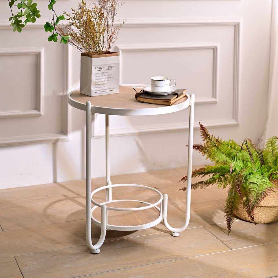 โต๊ะกาแฟทรงกลมสไตล์ยุโรปสมัยใหม่ INNOVA ทำจากไม้สีขาวและโลหะ พร้อมชั้นวางของตกแต่งบ้าน เฟอร์นิเจอร์ห้องนั่งเล่น