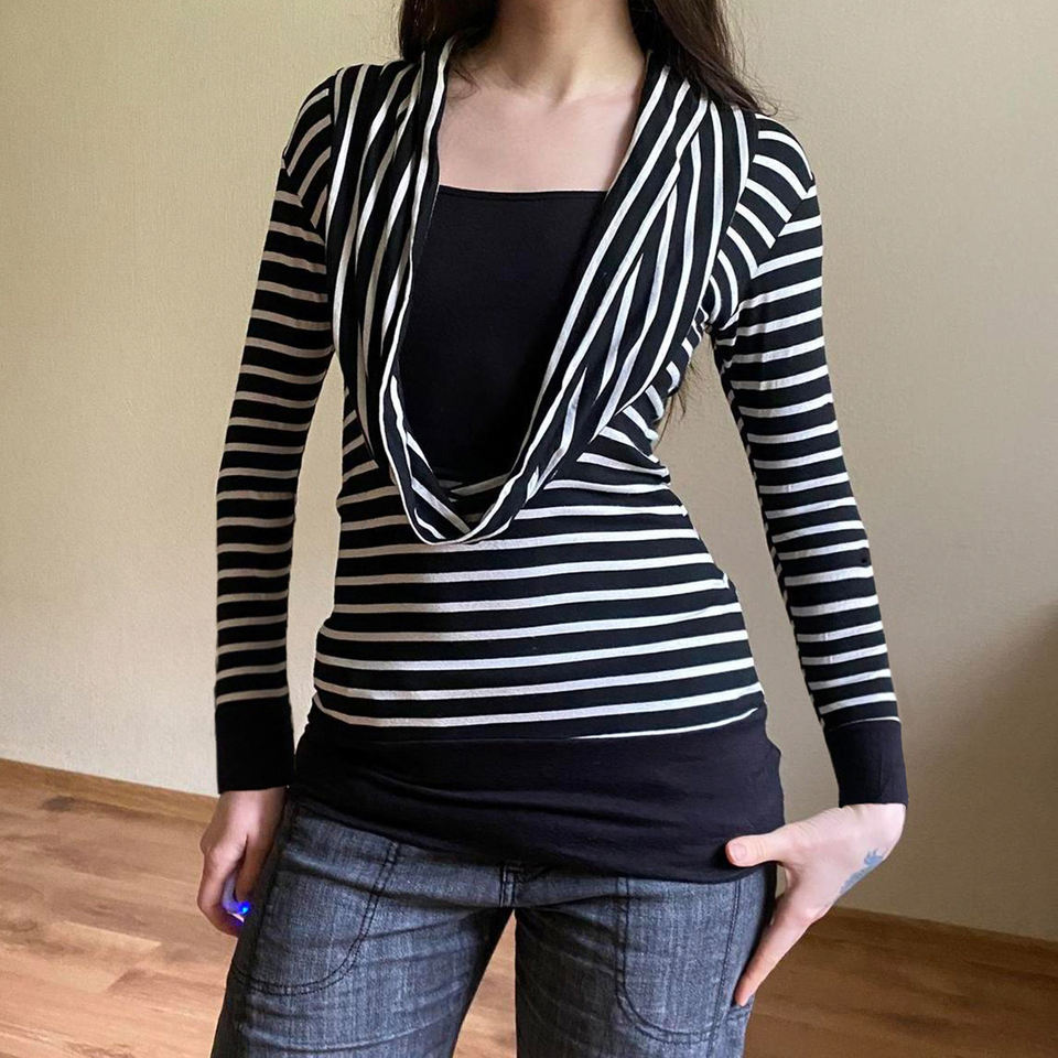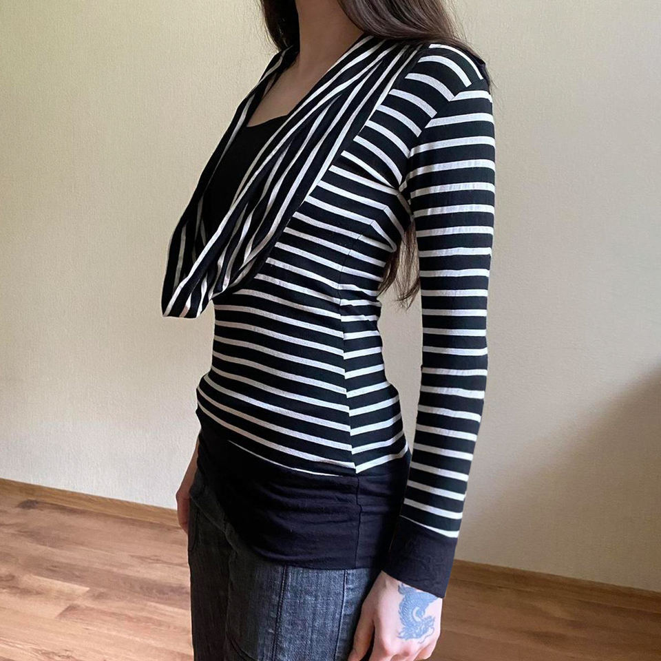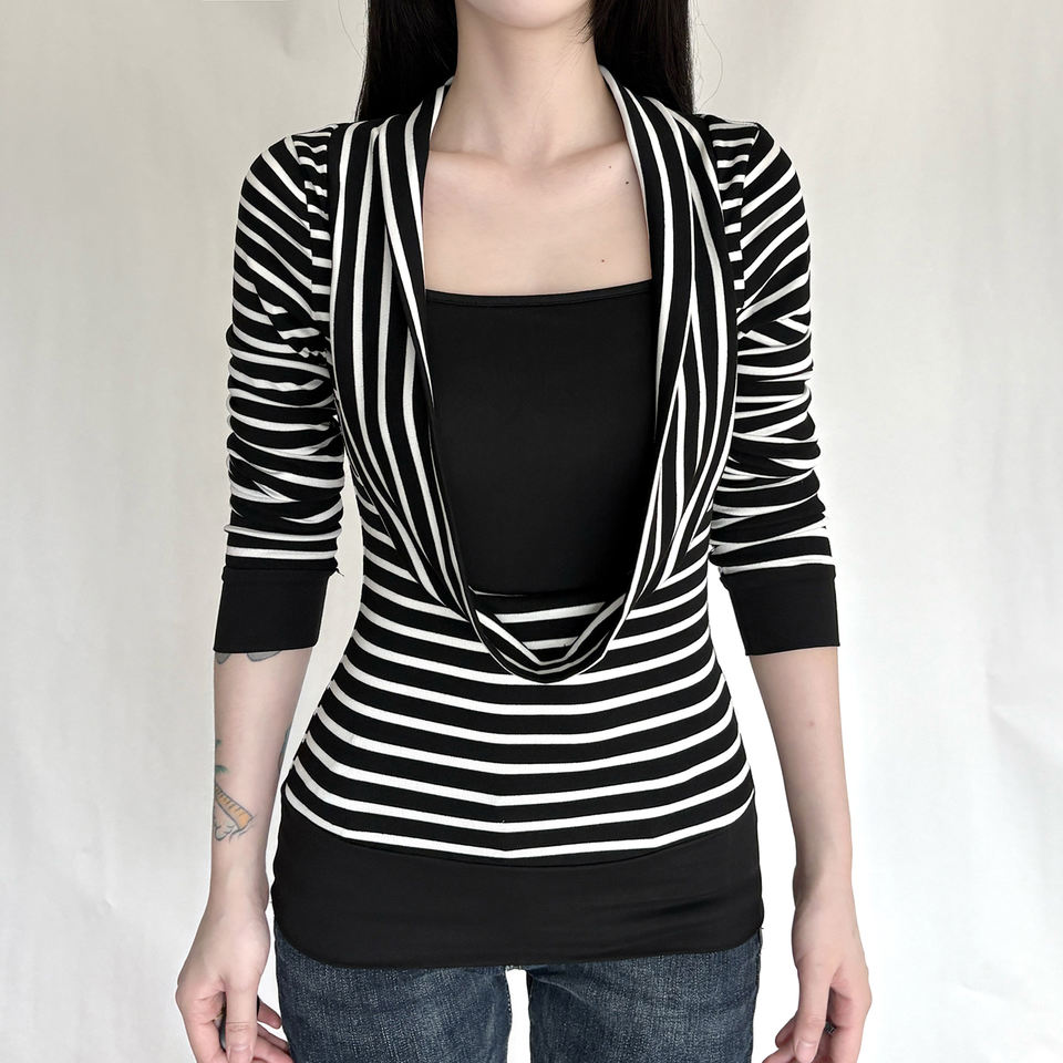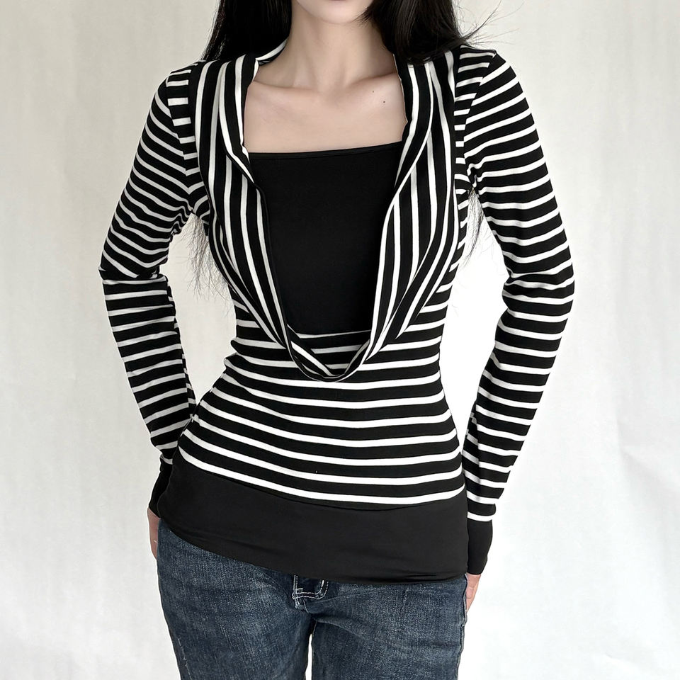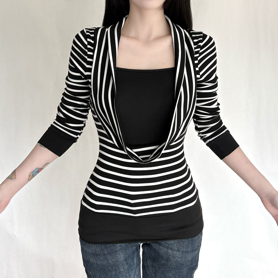เสื้อยืดแขนยาวลายทางสไตล์ INS แต่งเลเยอร์ คอวีทรงเข้ารูปสำหรับผู้หญิง