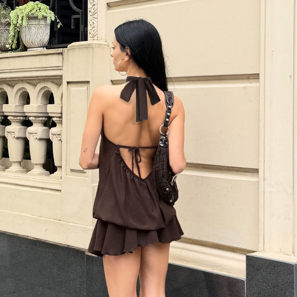 เดรสยาวทรงฮาลเตอร์สีพื้นสไตล์เรโทรสำหรับผู้หญิง แต่งระบายผ้าแบบแพทช์เวิร์ค เปิดหลังผูกเชือก ดีไซน์หรูหราและเซ็กซี่