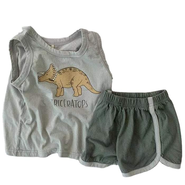 ชุดเสื้อผ้าเสื้อแขนกุดพิมพ์ลายไดโนเสาร์สำหรับเด็กทารกและกางเกงขาสั้นสำหรับฤดูร้อน