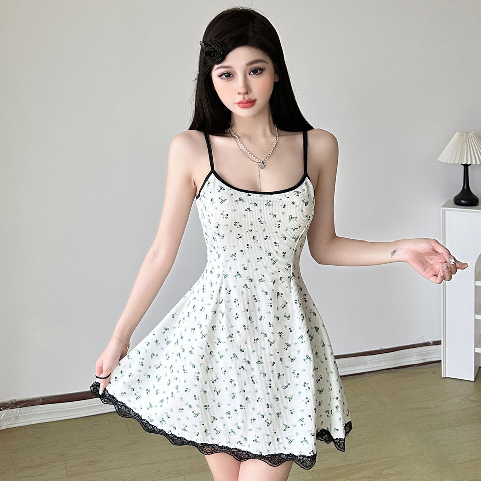 INS ชุดเดรสลายดอกไม้สดใสสำหรับฤดูร้อน แต่งลูกไม้ทรงเอ-ไลน์ มินิเดรสทรงเข้ารูป ชุดเดรสสำหรับผู้หญิงอ่อนเยาว์
