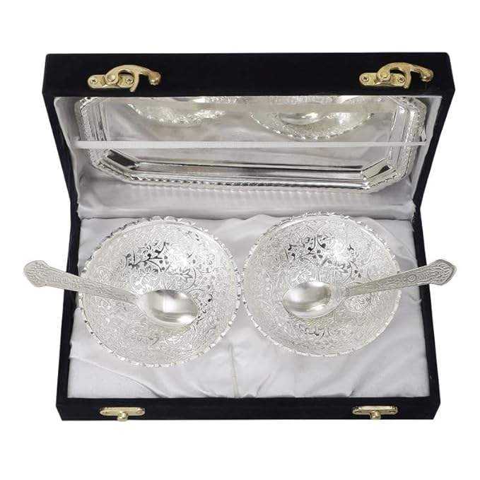 ชุดถาดสองชั้นเงินเยอรมันสุดหรู พร้อมช้อน กล่องกำมะหยี่สีดำ ของขวัญสำหรับงานดิวาลี ของขวัญองค์กร ลายโบราณ ภาชนะสำหรับรับประทานอาหาร