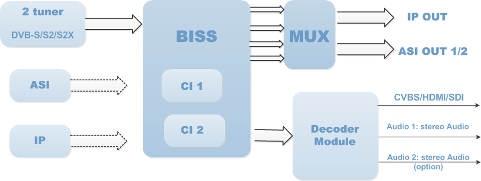 2 ASI in, 2 ASI out; IP in/outInput/Output