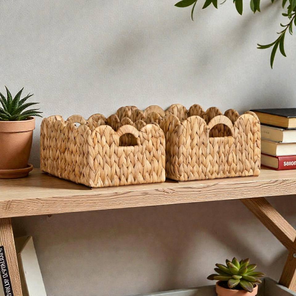 ชุดตะกร้าสานมือจากหญ้าไฮยาซินธ์ 2 ใบ รุ่น ISLA ขอบหยัก พร้อมหูจับแบบเจาะรู สำหรับจัดระเบียบและตกแต่งห้องเด็ก ห้องนั่งเล่น ห้องนอน โรงแรม