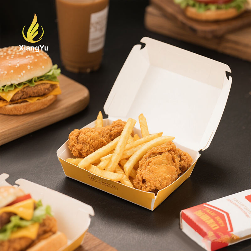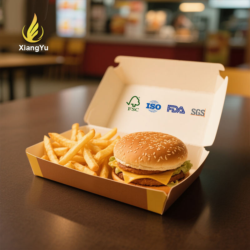 กล่องกระดาษคราฟท์เกรดอาหารสำหรับเบอร์เกอร์และเฟรนช์ฟรายส์ ได้รับการรับรองมาตรฐาน ISO เป็นมิตรกับสิ่งแวดล้อม ออกแบบได้ตามต้องการสำหรับบรรจุภัณฑ์อาหารจานด่วน