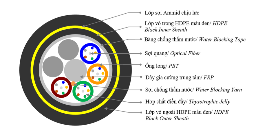 สายเคเบิลใยแก้วนำแสง G652D ที่ผ่านการรับรอง ISO สำหรับกลางแจ้งขนาด300ม. ช่วง6-96แกนกลางด้านนอกเป็นแผ่น HDPE แบบควั่นผลิตในเวียดนาม