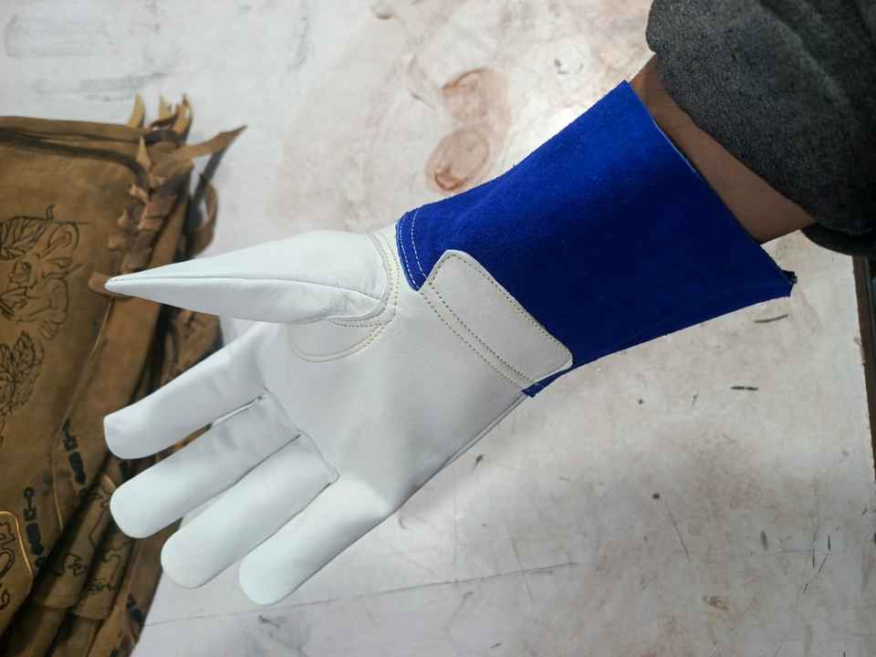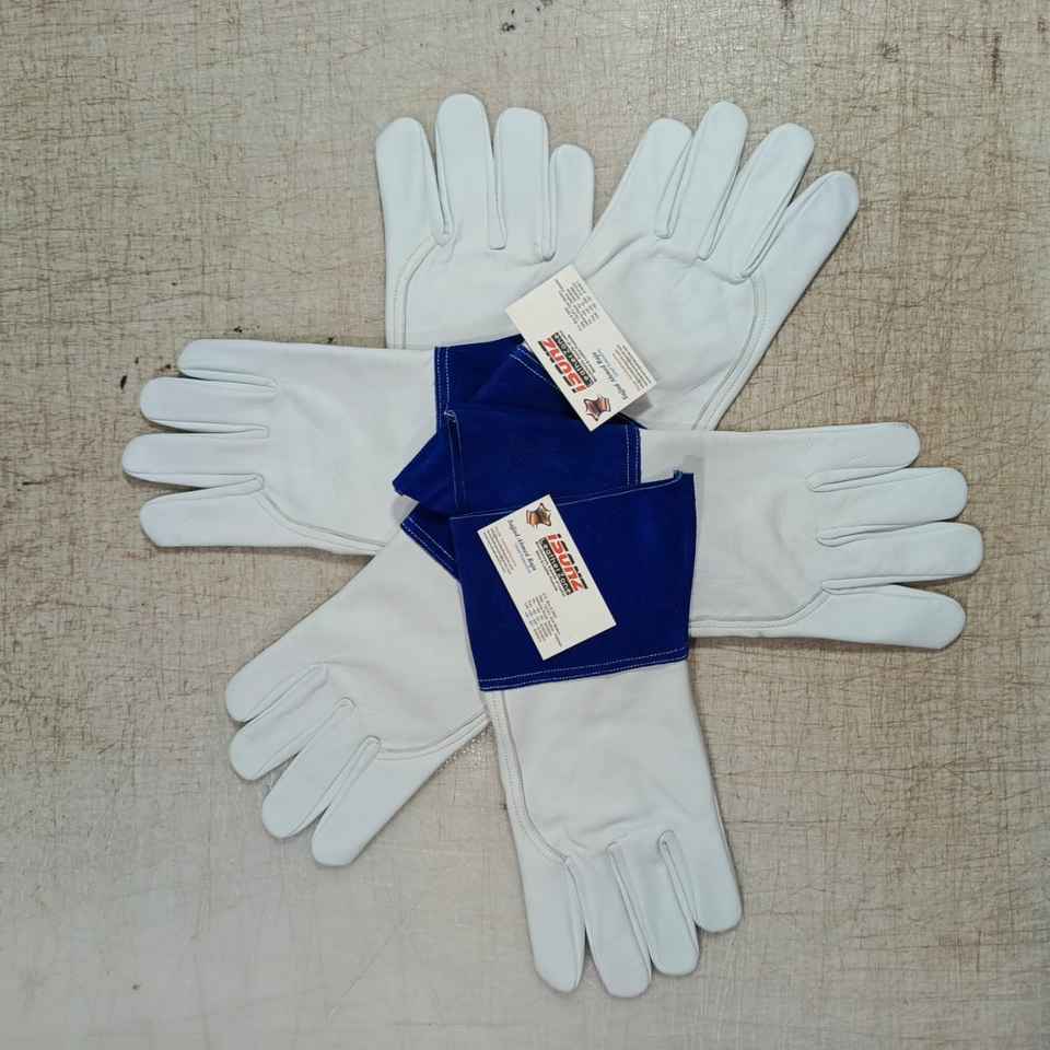 ISONZ Leather Zone Cowhide White & Blue Suede Cuff Tig Welder Gloves 12 Inch Customizable Size Heat Resistant 1.2mm Thick