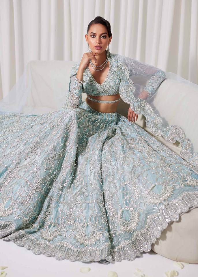 Ice Blue Net Hued Blouse Lehnga Dupatta Luxury Indian Pakistani Clothing Silver Metalwork Dainty Pearls Crystals Unmatched