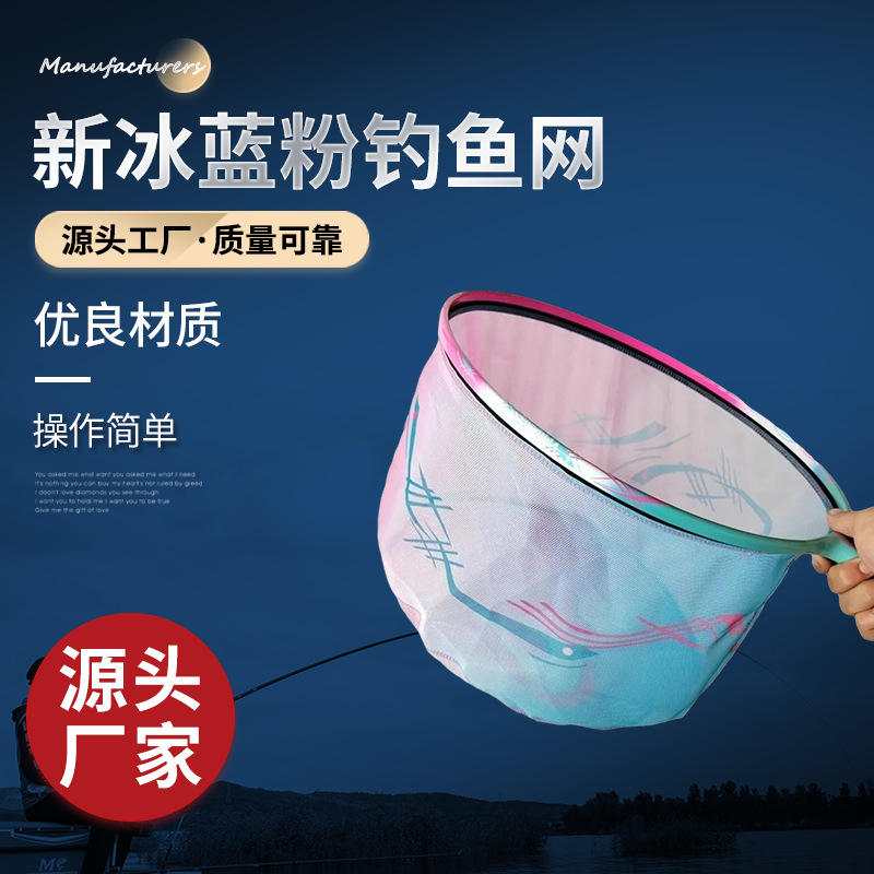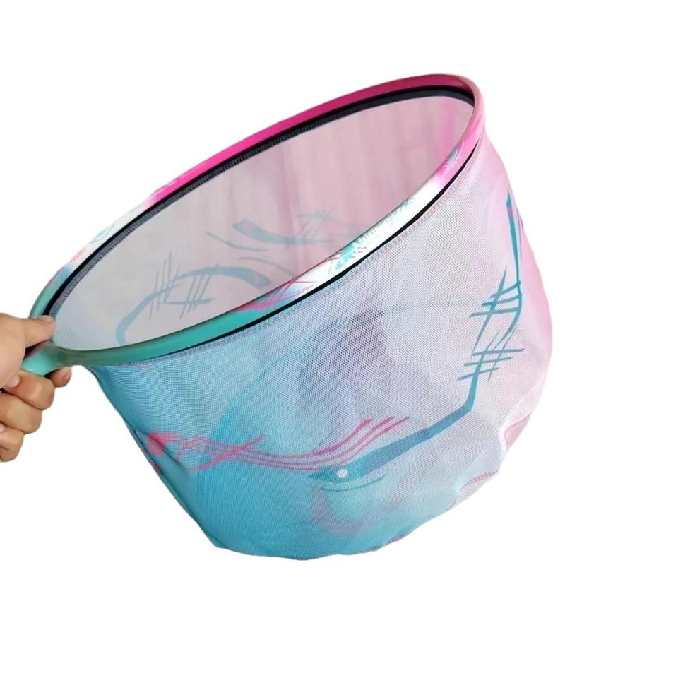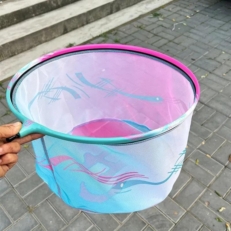 ตาข่ายดักปลาสีฟ้าชมพู ขนาดเส้นผ่านศูนย์กลาง 40 ซม. ตาข่ายไนลอนความแข็งแรงสูง สำหรับตกปลาดำในบ่อ พร้อมระบบเก็บน้ำในตัว