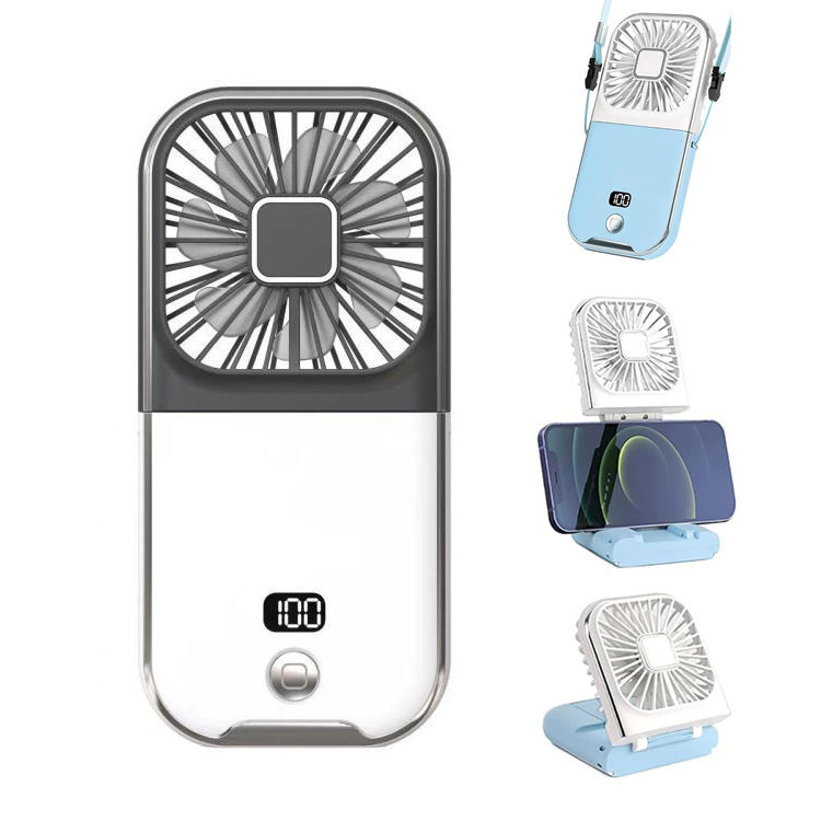 พัดลมคล้องคอแบบพับได้ ใช้พลังงานจากแบตเตอรี่แบบชาร์จ USB พร้อมแบตสำรองในตัว ปรับความเร็วได้สามระดับ เสียงเบา เหมาะสำหรับใช้กลางแจ้ง ตั้งแคมป์ โรงแรม รถยนต์ และในบ้าน