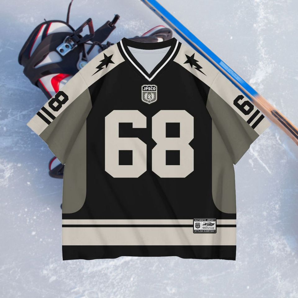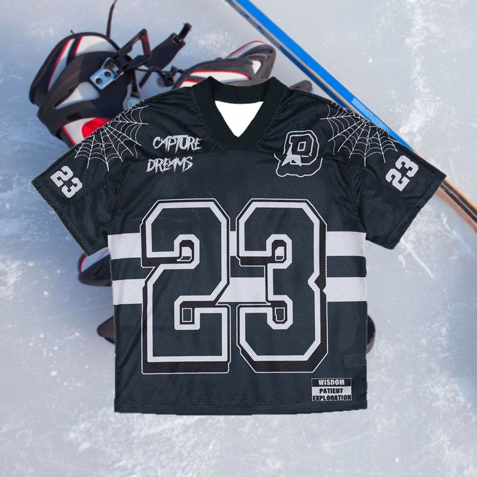 ชุดสูทฮ็อกกี้น้ำแข็งสำหรับผู้ชายเสื้อยืดคอวีพิมพ์ลายดิจิทัลทรงหลวมกีฬาแขนสั้นใส่สบาย3D