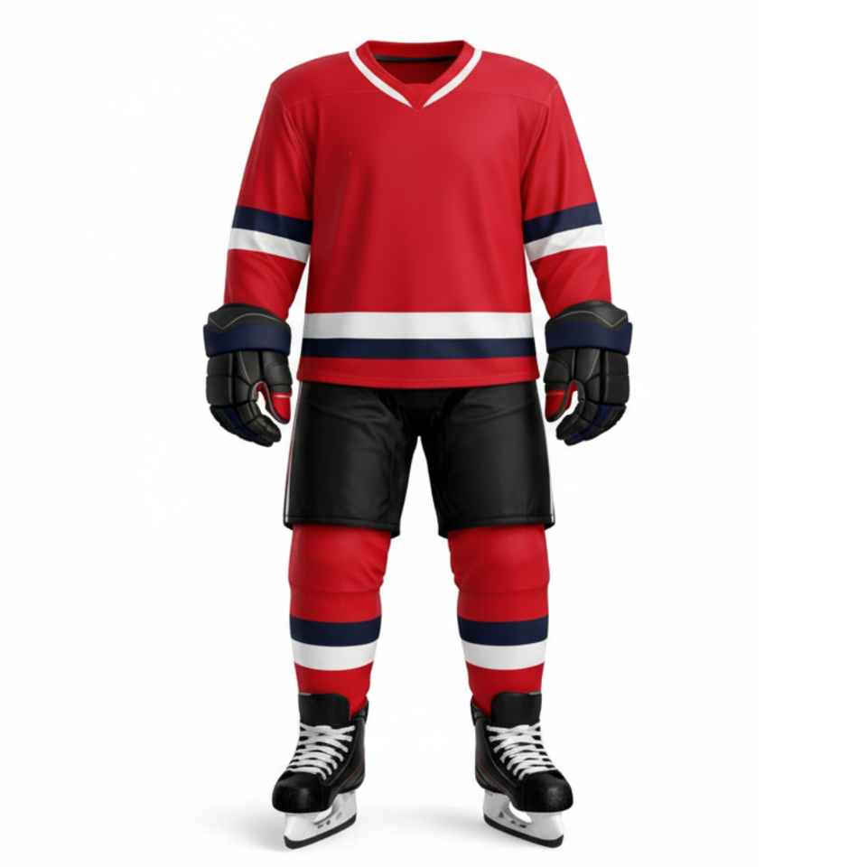 ชุดยูนิฟอร์มฮ็อกกี้น้ำแข็ง เสื้อเจอร์ซีย์สีแดงล้วน พร้อมแถบสีน้ำเงินกรมท่าและสีขาวแนวนอน ชุดกีฬาสำหรับผู้ชาย