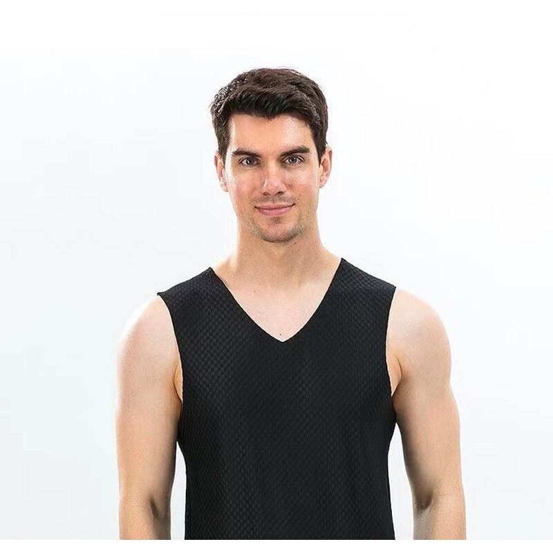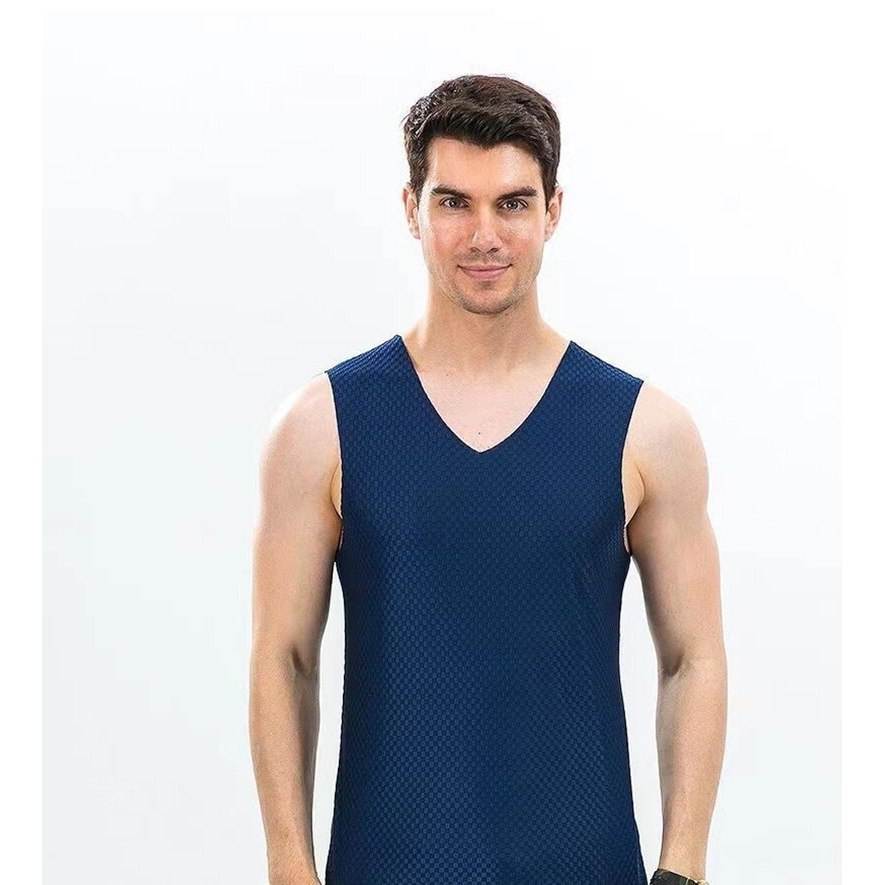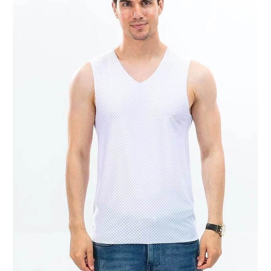 เสื้อกั๊กผ้าไหมน้ำแข็งผู้ชาย ลายตาราง ไร้รอยต่อ ทรงเข้ารูป บางเบา แห้งเร็ว คอวี แขนกุด ดีไซน์ตาข่ายยืดหยุ่น สวมใส่สบาย