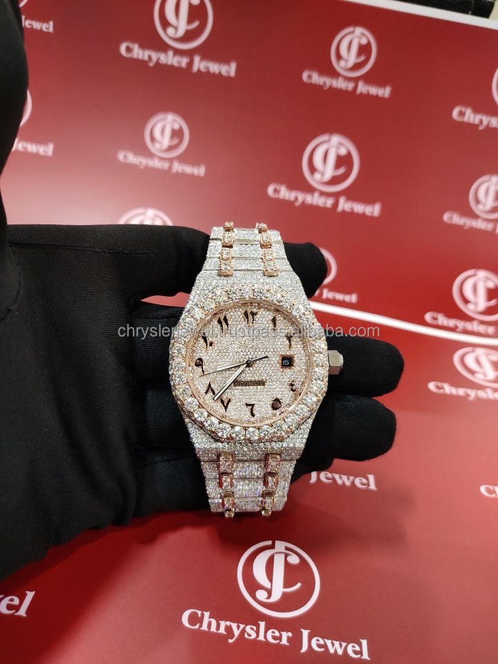 นาฬิกาสเตนเลสหน้าปัดใหญ่สุดเก๋ VVS Moissanite สายรัดข้อมือแฟชั่นสายรัดข้อมือกลเครื่องทดสอบผ่านเพชรเต็มรูปแบบ