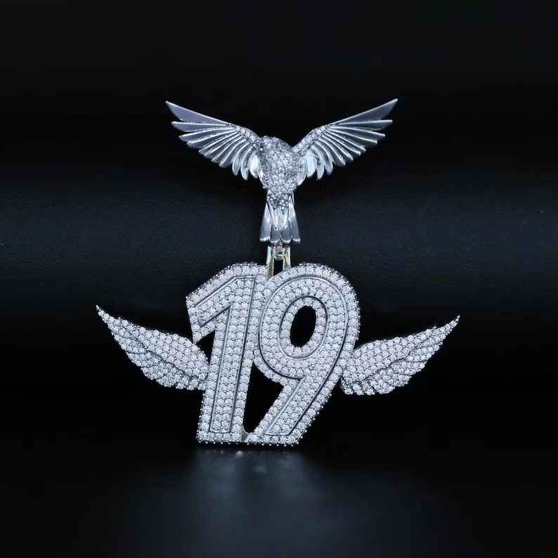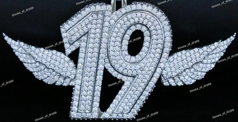 จี้รูปปีกนางฟ้าหมายเลข 19 แบบกำหนดเอง ชุบโรเดียม เงินแท้ 925 ประดับเพชรโมอิสซาไนต์ สไตล์ฮิปฮอป แฟชั่นทันสมัย