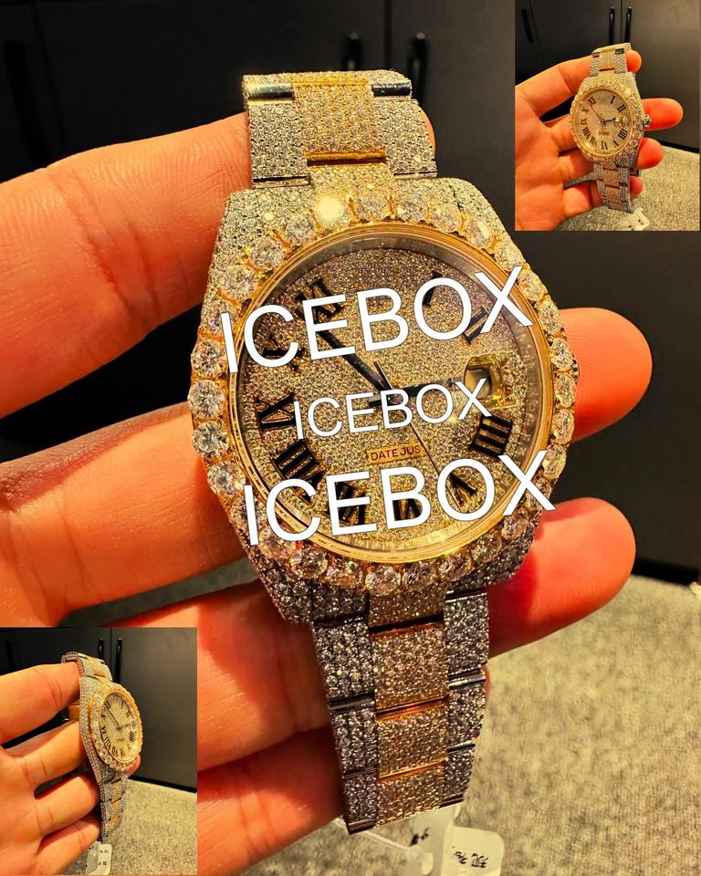 นาฬิกาข้อมือฮิปฮอปหรูหราอัตโนมัติสแตนเลสสตีลประดับมอยส์ซาไนต์แบบเย็น หน้าปัดกระจกสองสี สายแบบหัวเข็มขัด กันน้ำได้ 10 บาร์