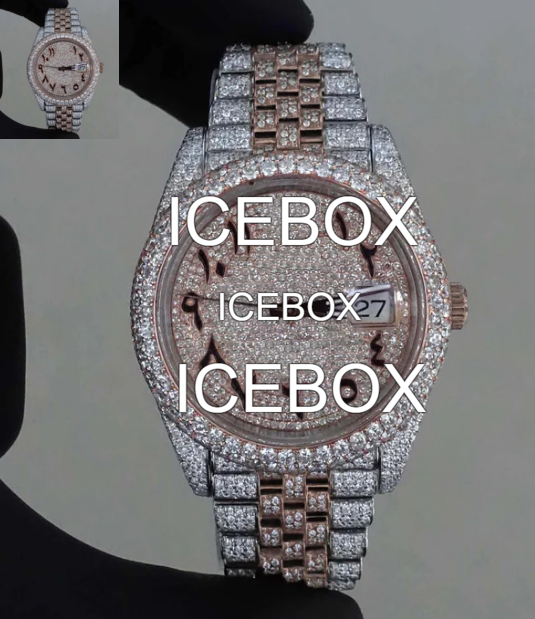 นาฬิกาข้อมือฮิปฮอปหรูหราอัตโนมัติสแตนเลสสตีลประดับมอสซาไนต์แบบเย็น ตัวเรือนกระจก หน้าปัดสแตนเลสสตีล สายประดับมอสซาไนต์ ตัวล็อคแบบ 10