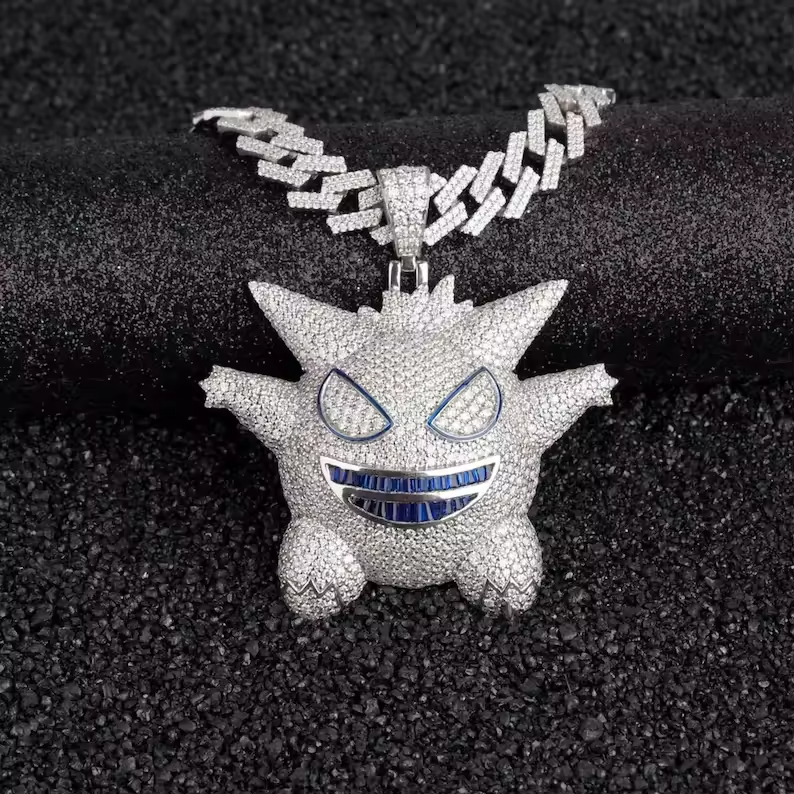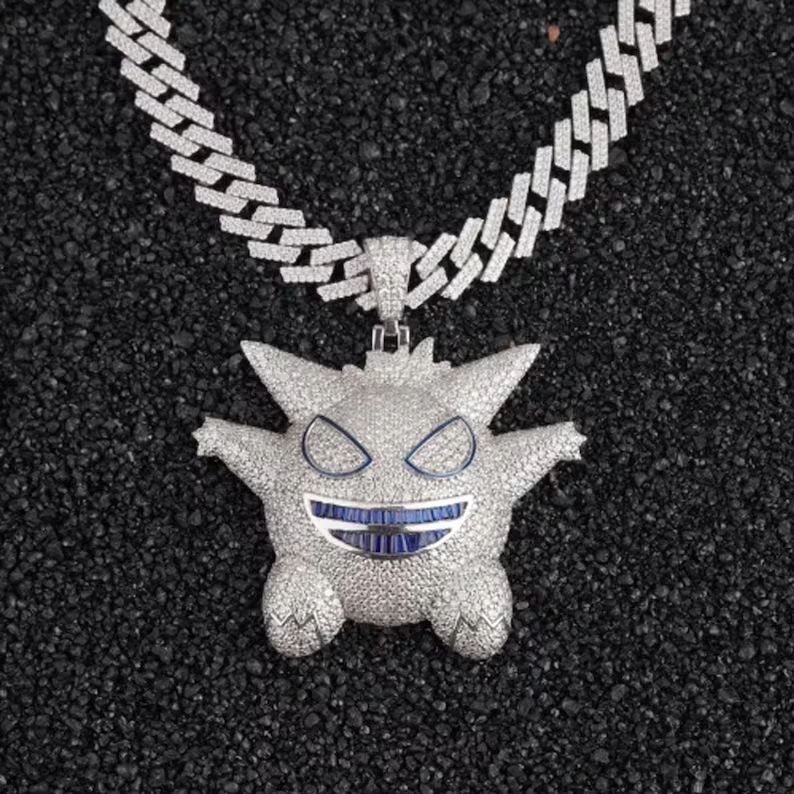 Iced Out Cartoon Monster Pendant Blue Moissanite Eyes and Mouth Silver Finish Custom Hip Hop Style Jewellery for Men