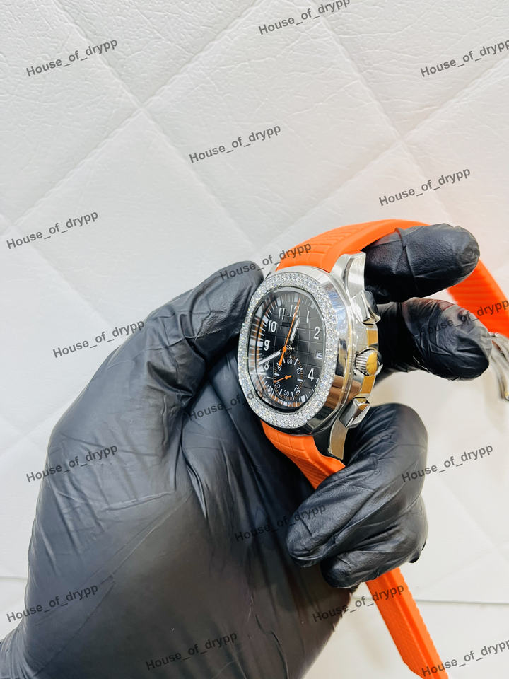 นาฬิกาโครโนกราฟแบบ Iced Out ตัวเรือนสแตนเลส ขอบประดับโมอิสซาไนต์ สายยางสีส้ม สไตล์ฮิปฮอป ดีไซน์โดดเด่น น้ำหนักเบา สำหรับทุกเพศ