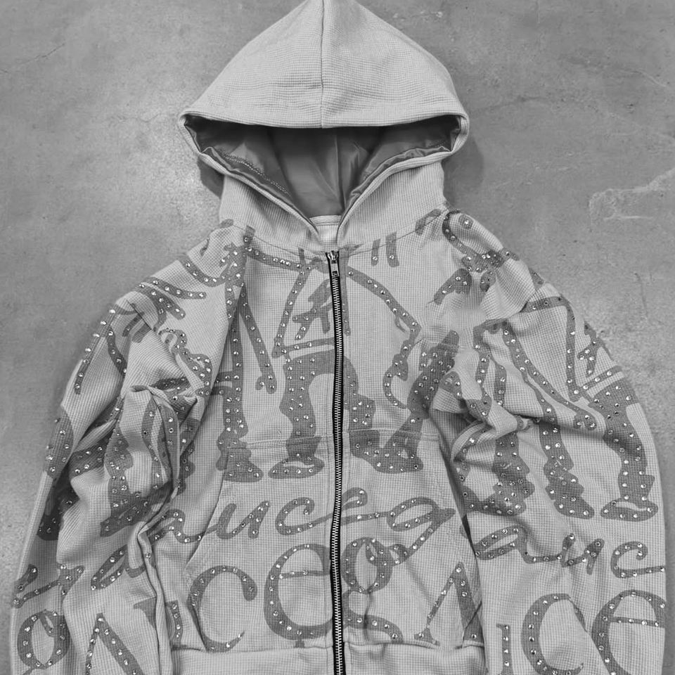 เสื้อมีฮู้ดประดับพลอยเทียมขนาดใหญ่พิเศษเสื้อฮิปฮอปสตรีทเสื้อมีซิปพร้อมตัวอักษรหยดเพชรสำหรับผู้ชายและผู้หญิง
