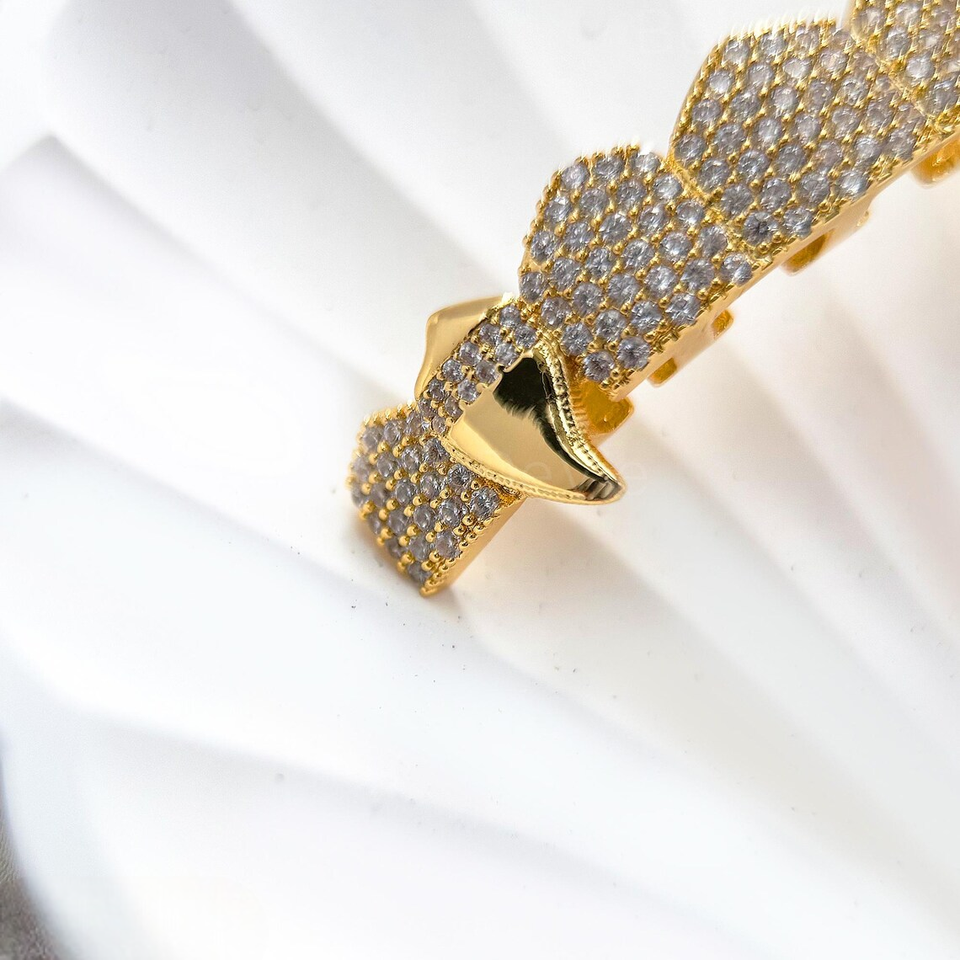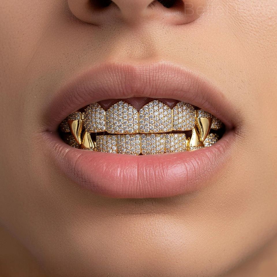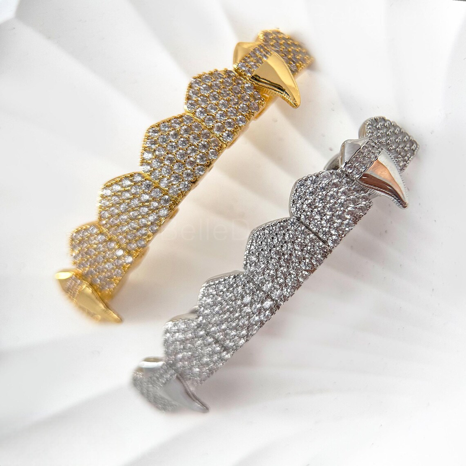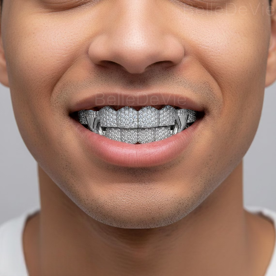กริลล์ฟันแบบ Iced Out ประดับเพชรโมอิสซาไนต์ สไตล์แวมไพร์สุดหรู ชุบโรเดียม ชุดฟันบนและล่างสั่งทำพิเศษ