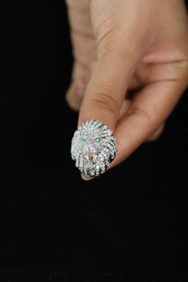 แหวนเงินแท้ 925 ประดับเพชรโมอิสซาไนต์ทรงสิงโต สไตล์ฮิปฮอป แหวนบลิงๆ แหวนสไตล์แร็ปเปอร์ เครื่องประดับ