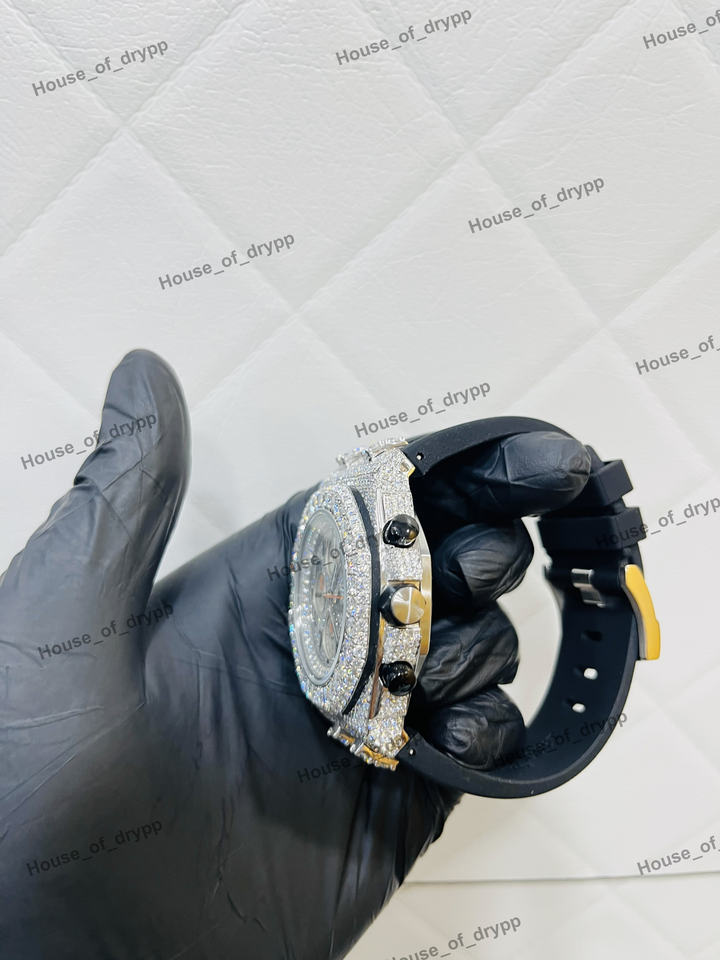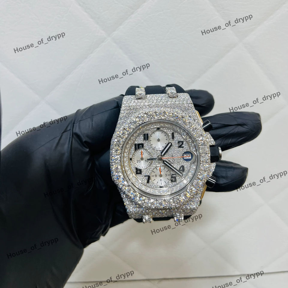 นาฬิกาโครโนกราฟหน้าปัดเพชรโมอิสซาไนต์แบบ Iced Out สำหรับผู้ชาย สไตล์ฮิปฮอปสุดหรู ตัวเรือนสแตนเลสสตีลแข็งแรงทนทาน