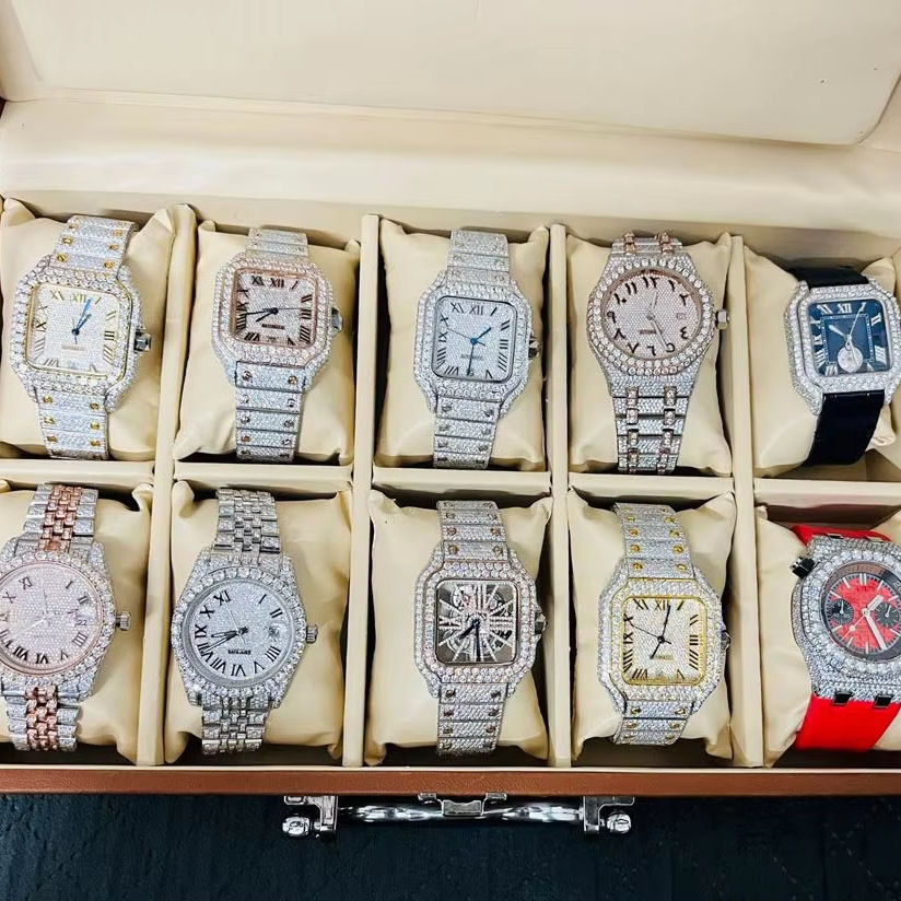 นาฬิกาข้อมือสเตนเลสสตีลประดับเพชรโมอิสซาไนต์แบบแอนะล็อก คอลเลคชั่นดีไซน์สี่เหลี่ยมและทรงกลมหลากหลายแบบ แพ็ค 10 เรือน