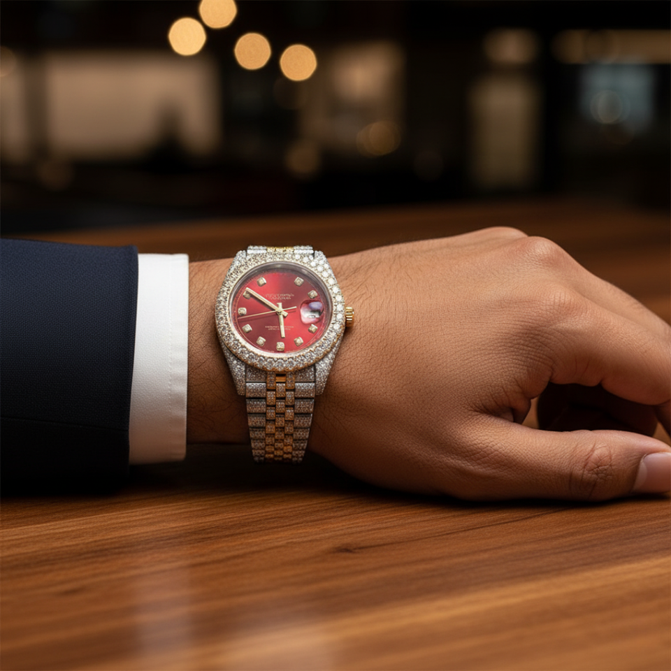 นาฬิกาโมอิสซาไนต์แบบฝังเพชร หน้าปัดสีแดง สองสี ทอง-เงิน หรูหรา สไตล์เพชร นาฬิกาฮิปฮอป นาฬิกาบลิงๆ นาฬิกาผู้ชาย นาฬิกาข้อมือสุดหรู เป็นของขวัญ