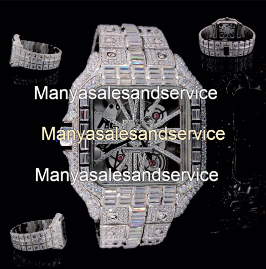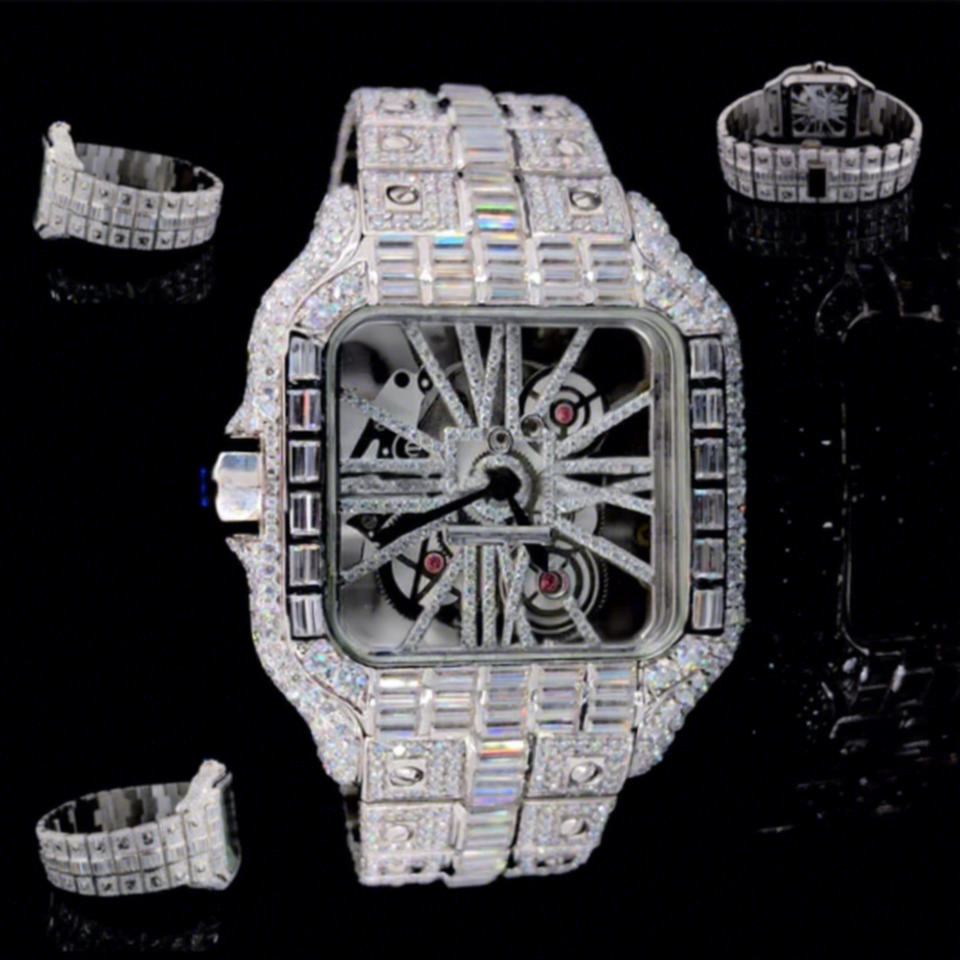 นาฬิกาสแตนเลสสตีลประดับเพชรโมอิสซาไนต์ทรงเหลี่ยมแบบสั่งทำพิเศษ หน้าปัดเปลือย ประดับเพชรเต็มเรือน สำหรับงานปาร์ตี้ เหมาะสำหรับผู้ชาย