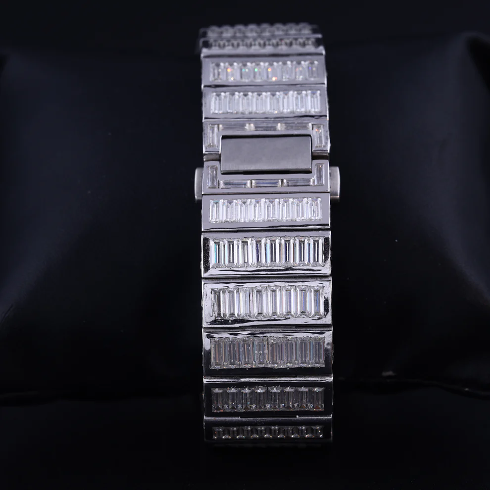 นาฬิกาข้อมือ Iced Out Skeleton สีเงินทรงสี่เหลี่ยมประดับเพชรทรงบาแก็ตต์ ระบบออโตเมติก ดีไซน์ฮิปฮอปสำหรับผู้ชาย ระดับพรีเมียม หรูหรา