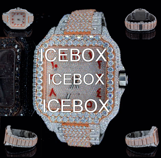 นาฬิกาโมอิสซาไนต์ทรงเหลี่ยมแบบ Iced Out หน้าปัดกระจก ตัวเรือนสแตนเลส กันน้ำ 10 บาร์ สายแบบหัวเข็มขัด สไตล์ฮิปฮอป