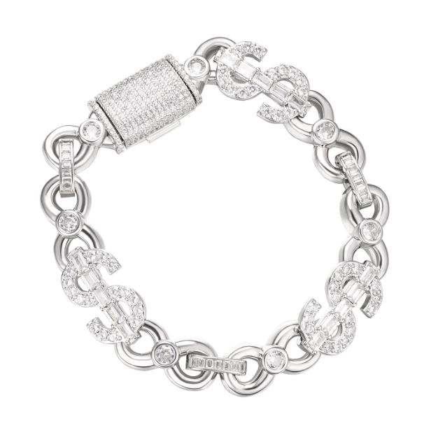 สร้อยข้อมือเงินแท้ 13 มม. ลายสัญลักษณ์ดอลลาร์ ประดับเพชร สไตล์ฮิปฮอป