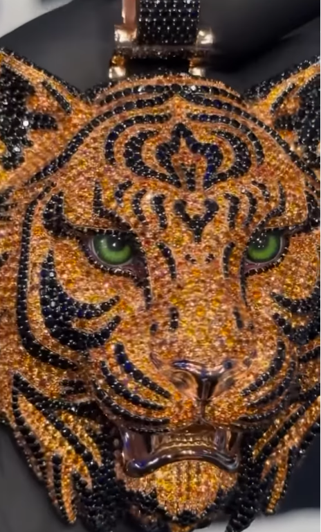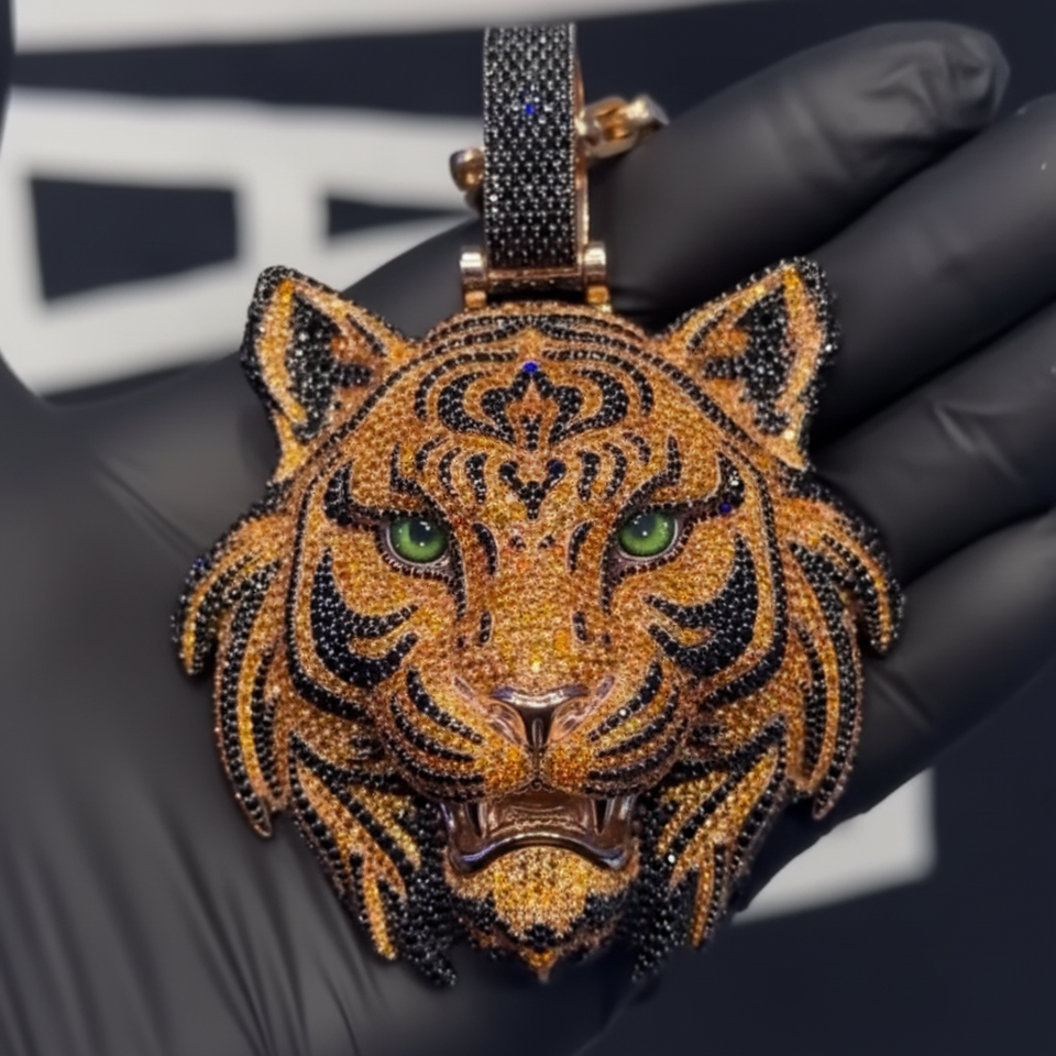 จี้หัวเสือประดับเพชรโมอิสซาไนต์สีทองสำหรับผู้ชาย สไตล์ฮิปฮอป ประดับด้วยหินสีดำและสีส้ม