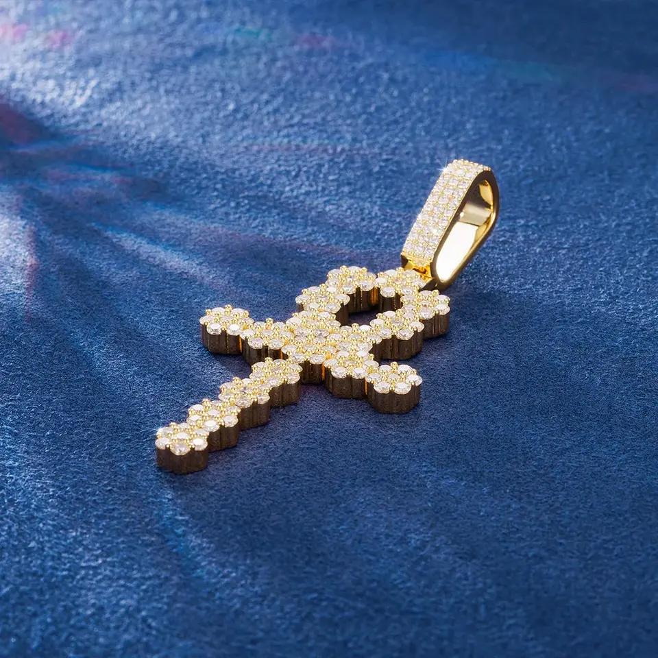 จี้รูปไม้กางเขนสไตล์ฮิปฮอปโมอิสซาไนท์จี้สีเหลืองทองประดับสัญลักษณ์อียิปต์
