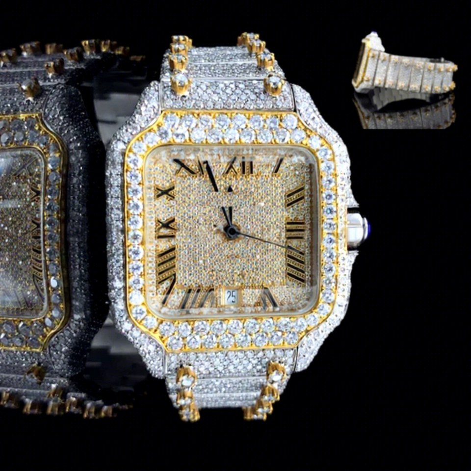 นาฬิกาโครโนกราฟเพชรโมอิสซาไนต์ VVS สองสี ทองเหลือง พร้อมหน้าปัดทรงสี่เหลี่ยม ตัวเรือนสแตนเลสสตีล พร้อมกระจก