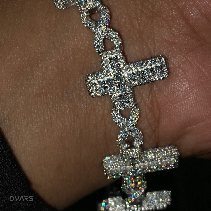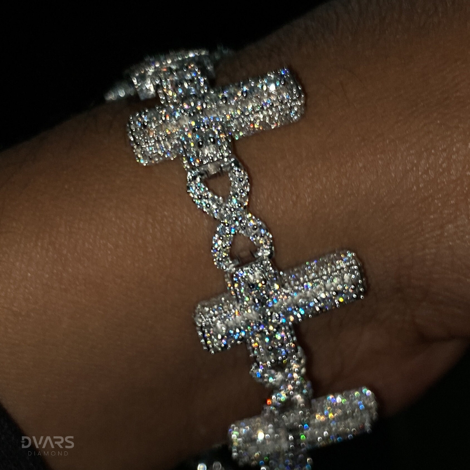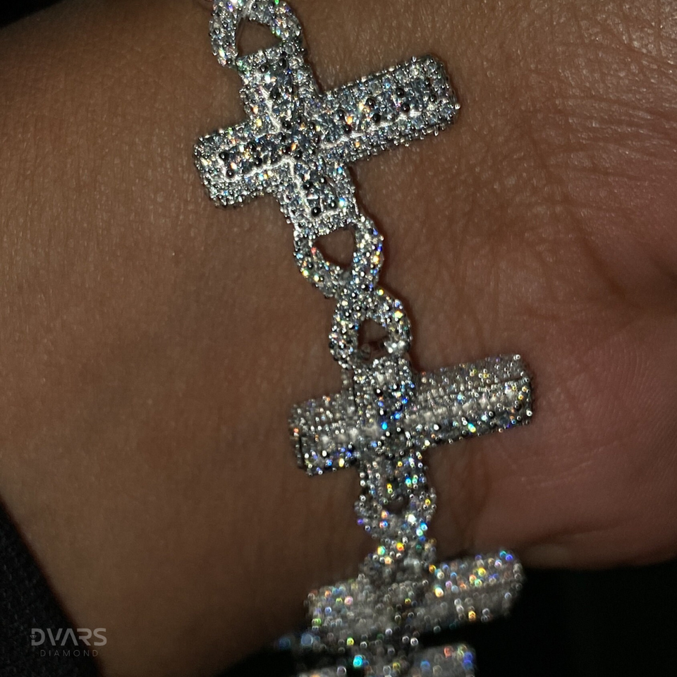 สร้อยข้อมือคริสเตียนหรูหราสำหรับผู้ชาย ดีไซน์แบบโซ่เชื่อมต่อรูปกากบาท ประดับเพชรโมอิสซาไนต์ VVS แบบไอซ์พาเว่ ทำจากเงินสเตอร์ลิงชุบโรเดียม พร้อมตัวล็อกแบบกล่อง