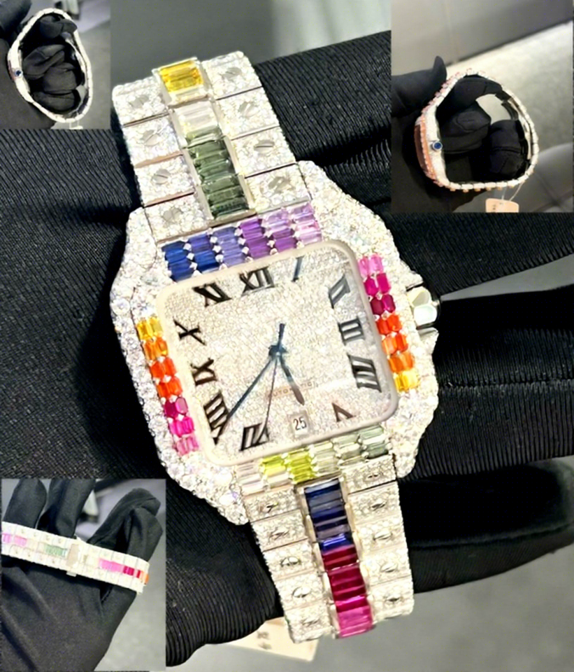 นาฬิกาโครโนกราฟเพชรโมอิสซาไนต์สีขาวทองคำขาวสองสี Iced VVS ตัวเรือนทรงเหลี่ยม สายสแตนเลสสตีล กระจกหน้าปัด