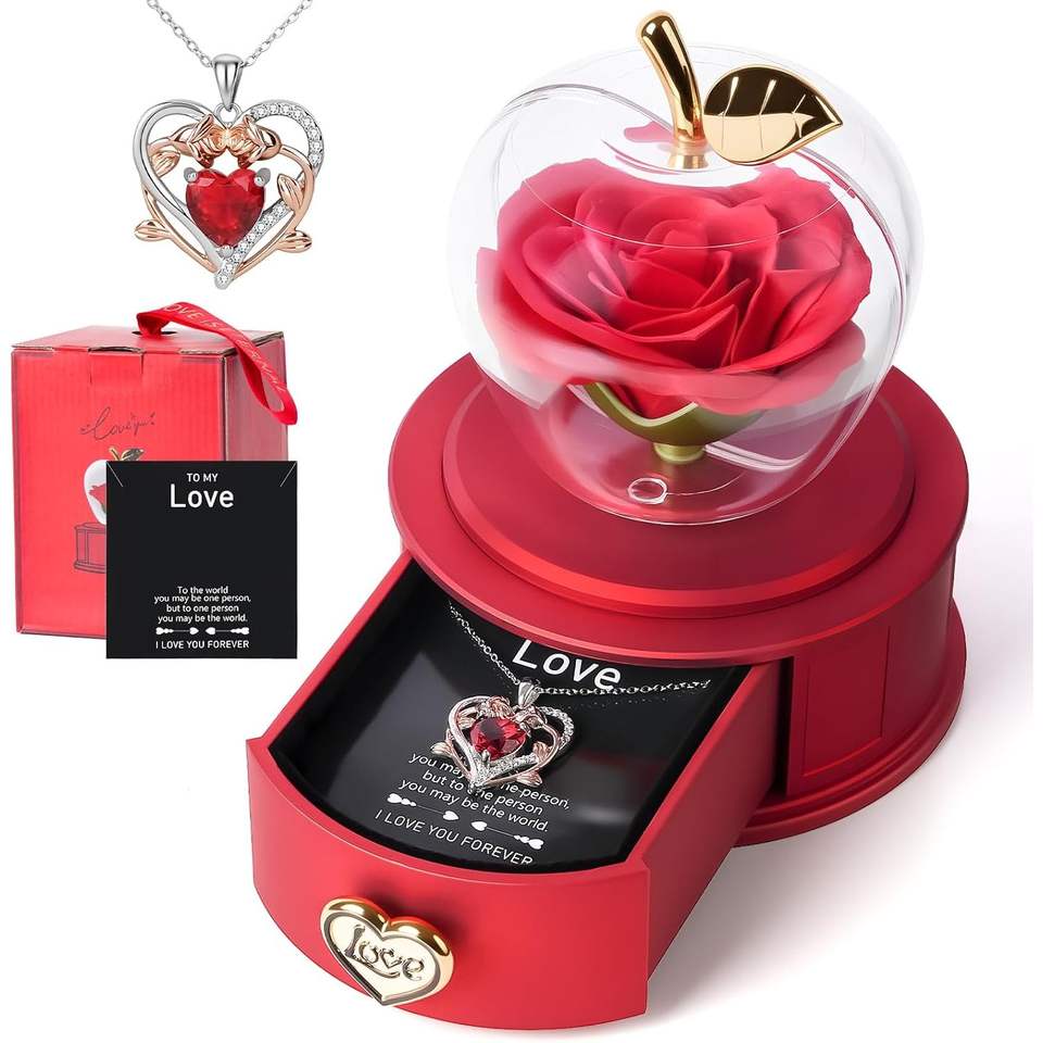 กล่องแอปเปิ้ลกุหลาบอมตะ Iceevery พร้อมสร้อยคอจี้รูปหัวใจประดับคริสตัลและเพชรเทียม ของขวัญสำหรับผู้หญิง แทนความรักนิรันดร์