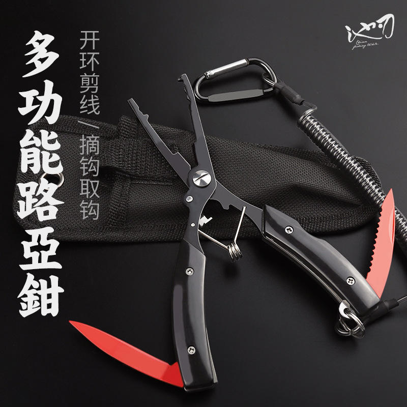 คีมตัดสายเอ็นตกปลา Ikeba รุ่น FG-1006E สีแดง ทำจากสแตนเลส พร้อมมีดและเชือกนิรภัย คีมถอดเบ็ดแบบพกพา