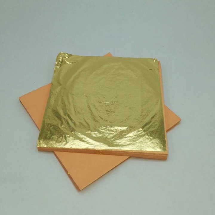 แผ่นทองคำเปลว (กระดาษ) ขนาด 14x14 ซม. ความหนา 0.15-0.2 ไมครอน ไม่ใช่แบบมีกาวในตัว คล้ายสีทองคำแท้ 24k สำหรับตกแต่ง
